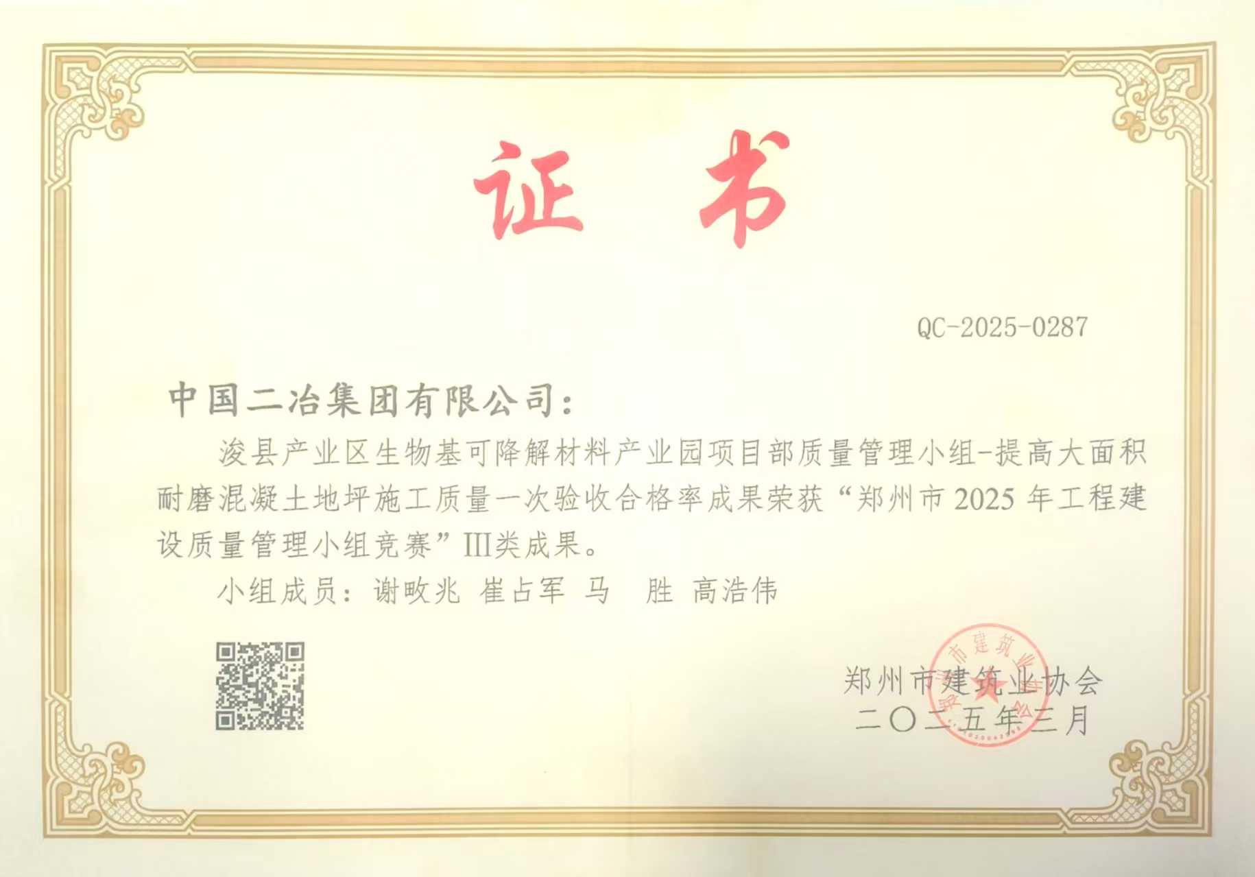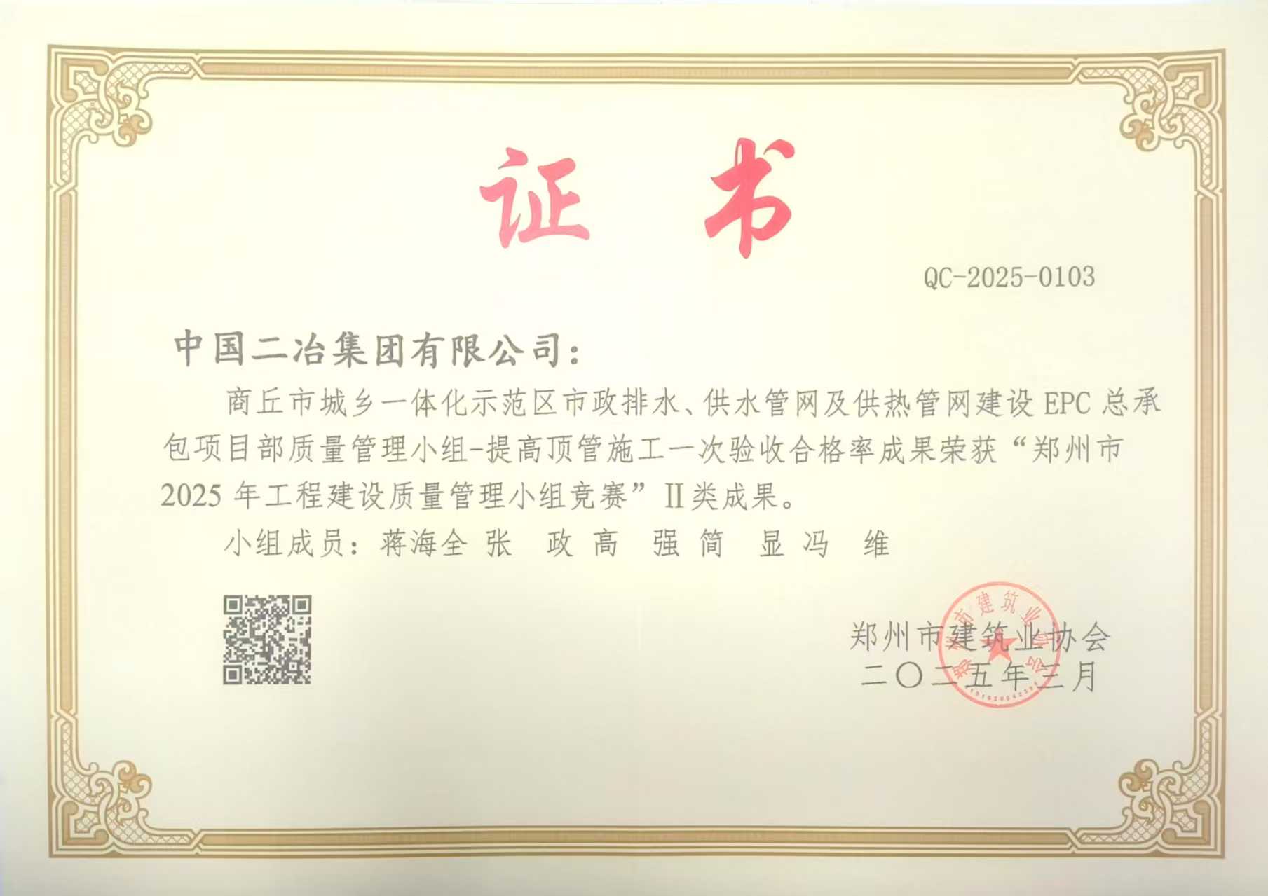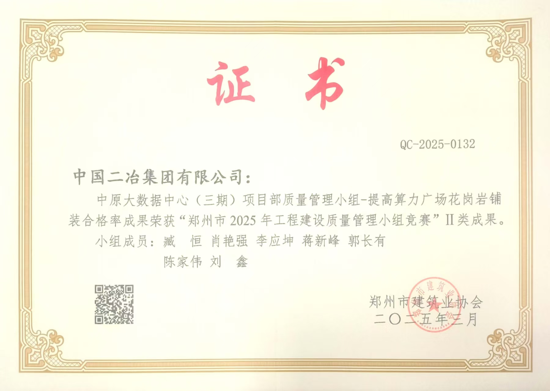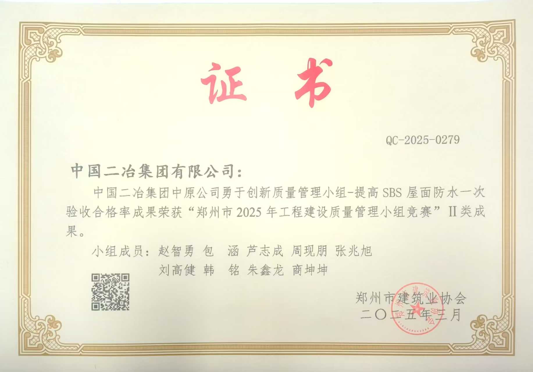 近日,由鄭州市建筑業(yè)協(xié)會舉辦的2025年鄭州市工程建設(shè)質(zhì)量管理小組競賽結(jié)果公布,中原公司四項QC成果獲得獎項。