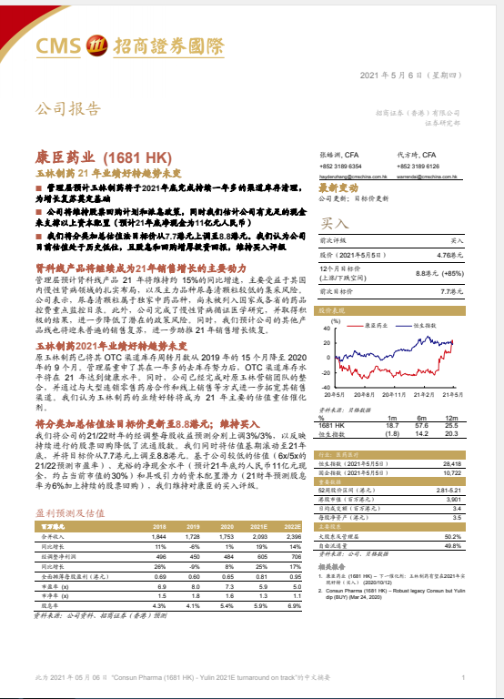 招商證券-康臣藥業(yè)1681:腎科是2021年銷售增長的主動力,玉藥業(yè)績好轉(zhuǎn)趨勢未變,維持買入評級,目標價上調(diào)至8.8港元