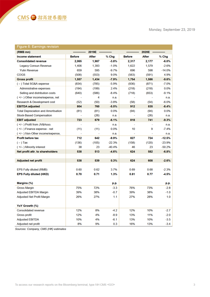 玉林方面,因渠道庫存壓力增大,玉林業(yè)績在2019H1同比下降7%。由于預(yù)期玉林業(yè)績調(diào)整將持續(xù)至2020-2021年,因此將玉林收入預(yù)期下調(diào)10%/14%。同時,在零售連鎖藥店的整合過程中,特許經(jīng)營目前與零售連鎖藥店的議價能力有限,因此預(yù)期產(chǎn)品在渠道的銷售價格將會下降。