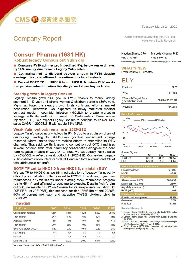 康臣藥業(yè)1681:康臣藥業(yè)分部收入穩(wěn)健增長(zhǎng)但玉藥分部下降, 維持買入評(píng)級(jí),目標(biāo)價(jià)調(diào)至8.0港元