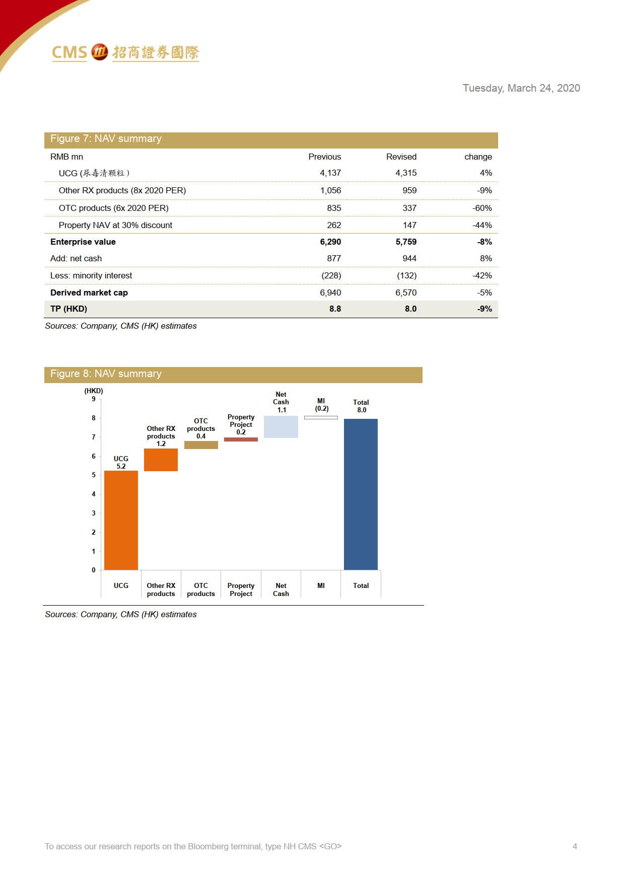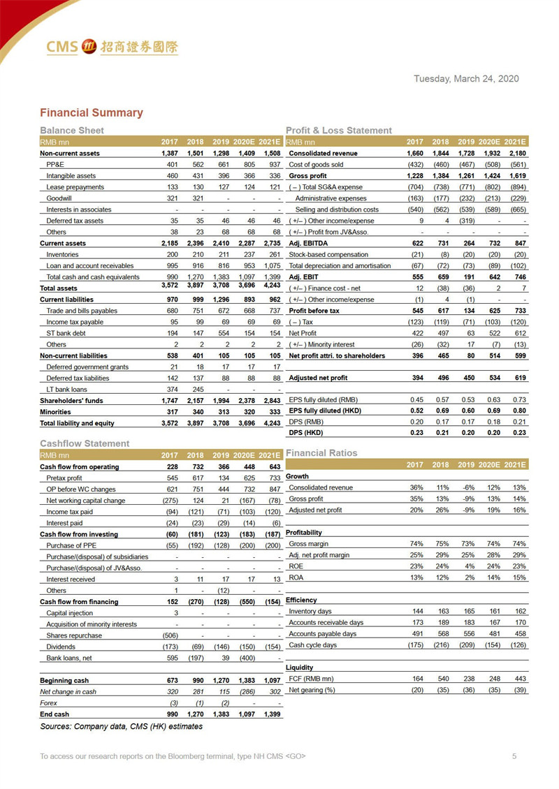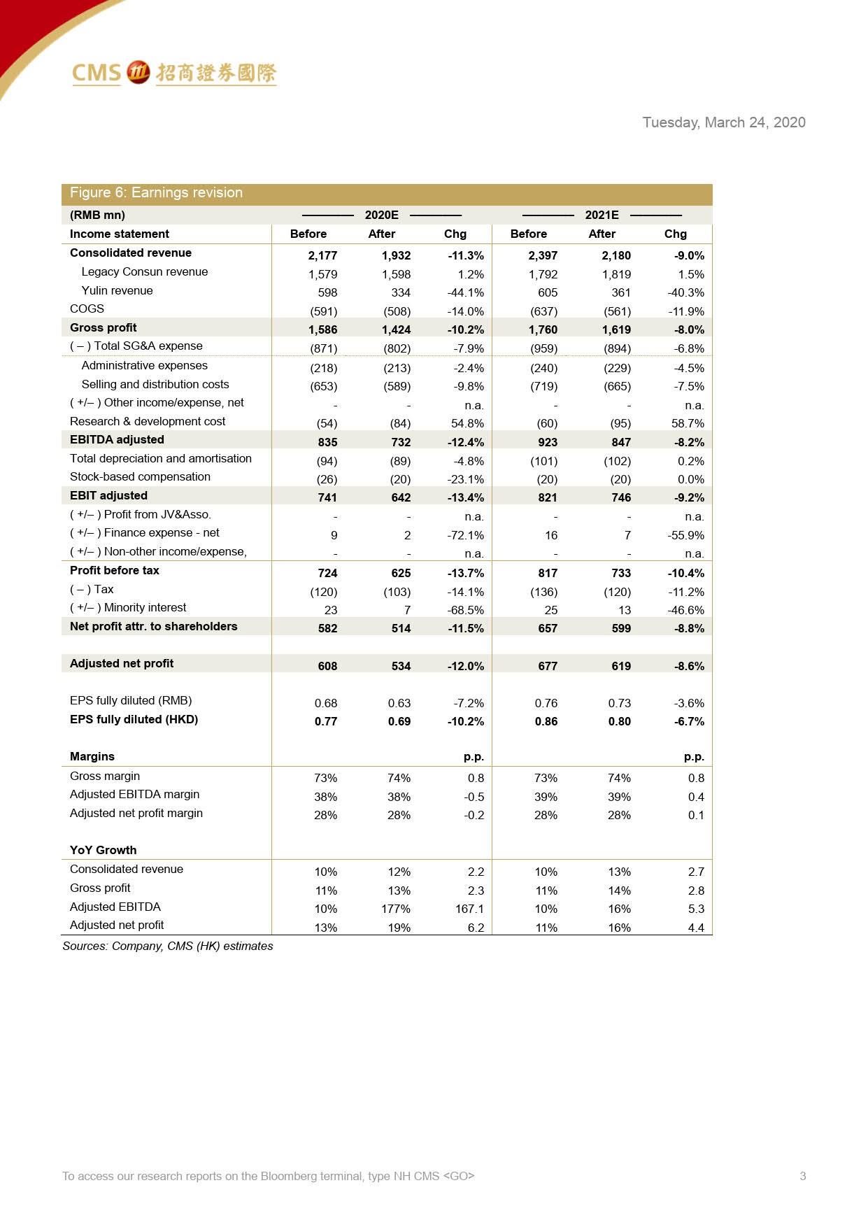 3、由于渠道去庫(kù)存壓力,玉藥分部的銷售額幾乎減半,也導(dǎo)致商譽(yù)減值約3.3億元。管理層表示他們正在努力優(yōu)化OTC渠道。但是在零售藥店整合以及疫情短期負(fù)面影響的背景下,競(jìng)爭(zhēng)加劇將使OTC專營(yíng)店處于弱勢(shì)地位,因此將玉藥2020-2021年的展望收入分別下調(diào)至3.34億元、3.61億元(2019年9月23日展望玉藥2020-2021年收入分別是5.98億元、6.05億元)。