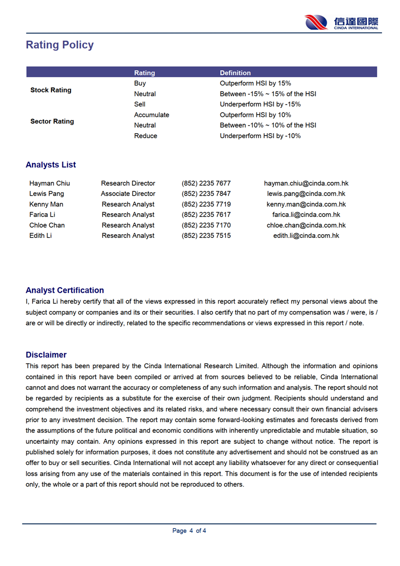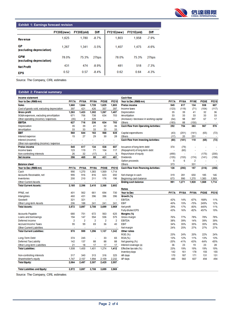 1、考慮疫情影響,調(diào)低公司2020-2021年收入預(yù)期(2020年16.25億元,2021年18.03億元)和EPS預(yù)期(2020年0.52,2021年0.62)。維持買入評價,將目標(biāo)價由6.25港元下調(diào)至6.0港元;