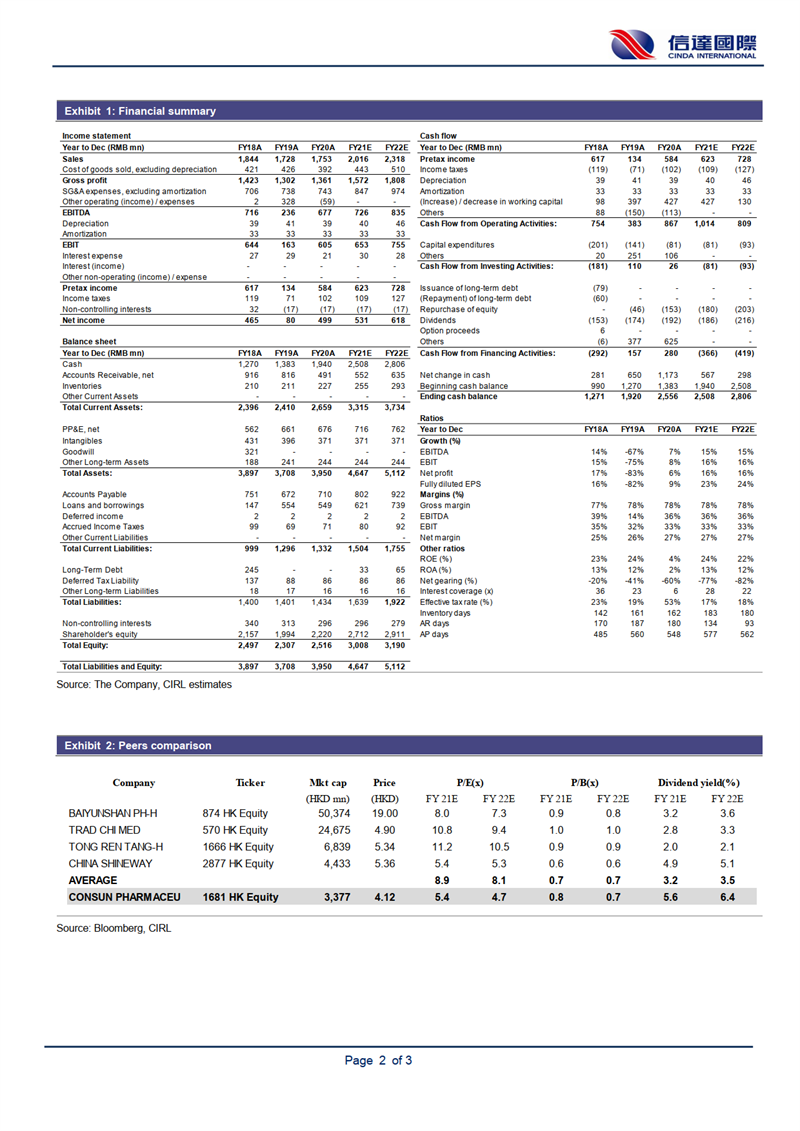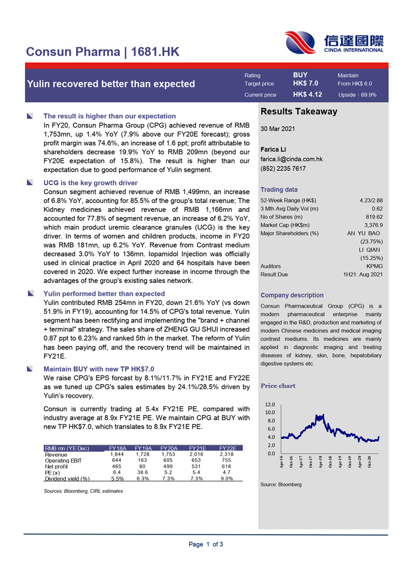 2、得益于玉藥的業(yè)績表現(xiàn),集團2020年收入、凈利潤的表現(xiàn)好于預(yù)期。尿毒清是集團收入的核心增長驅(qū)動。預(yù)計憑借現(xiàn)有銷售網(wǎng)絡(luò)優(yōu)勢,集團收入將進一步增加。