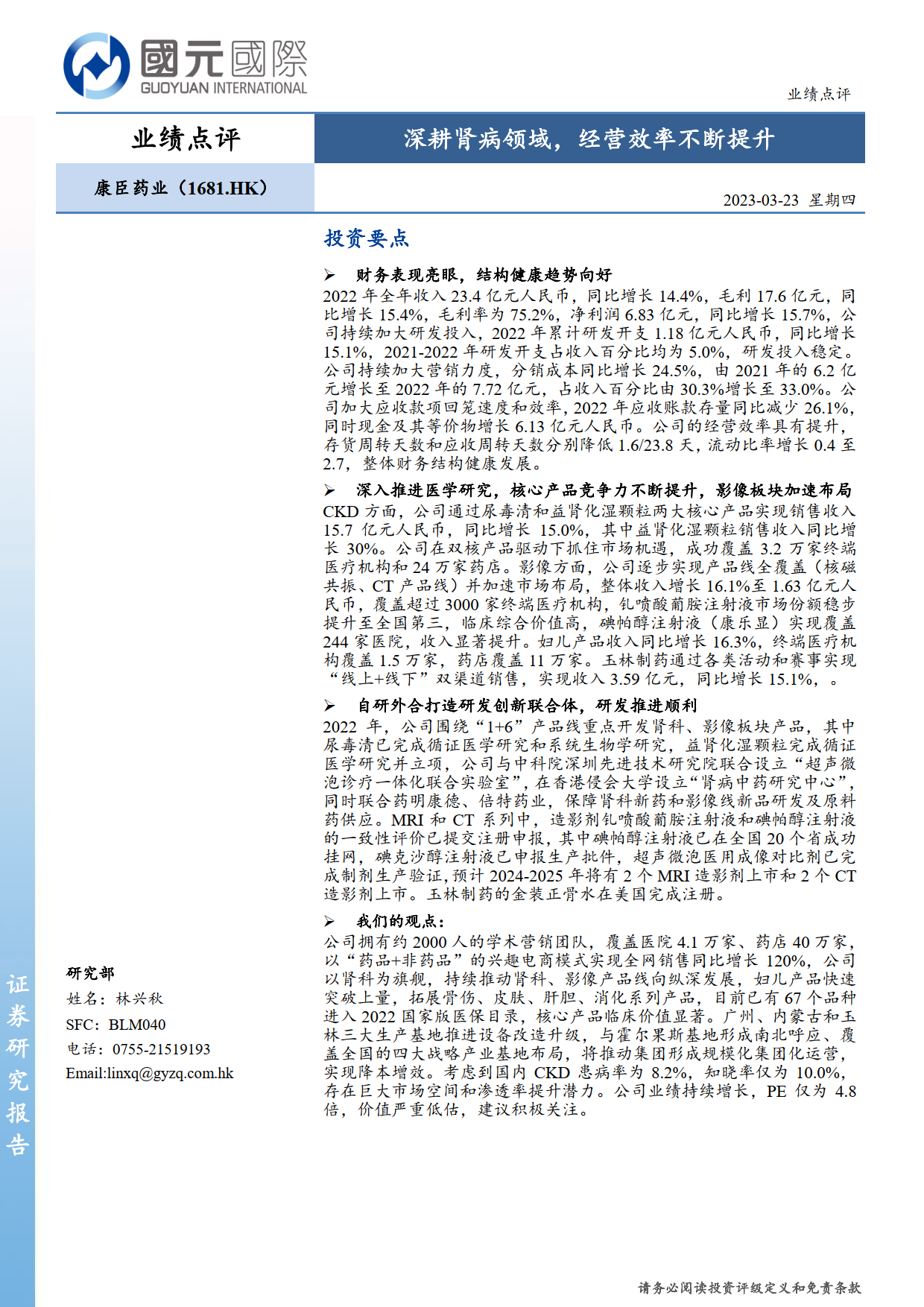 國(guó)元證券-康臣藥業(yè)1681.HK業(yè)績(jī)點(diǎn)評(píng):深耕腎科領(lǐng)域,經(jīng)營(yíng)效率不斷提升
