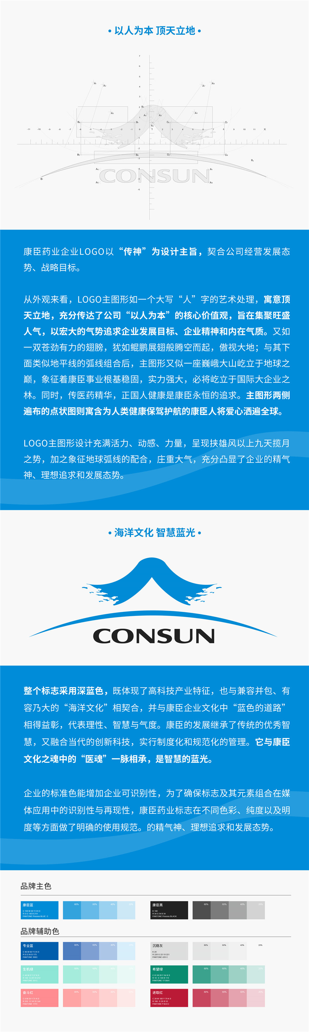 LOGO中康臣 英文標(biāo)準(zhǔn)字母“CONSUN”組合,更增強(qiáng)了與國際接軌的現(xiàn)代感。LOGO底部“康臣藥業(yè)”四個(gè)莊重古樸的藝術(shù)大字,讓整個(gè)標(biāo)志呈現(xiàn)了 “以人為本”的中華民族優(yōu)秀文化與現(xiàn)代經(jīng)營理念的完美結(jié)合,不僅表現(xiàn)出非同凡響的大企業(yè)特質(zhì)與文化品味, 更傳達(dá)了康臣藥業(yè)頂天立地、形神兼?zhèn)涞?ldquo;人”性形象。