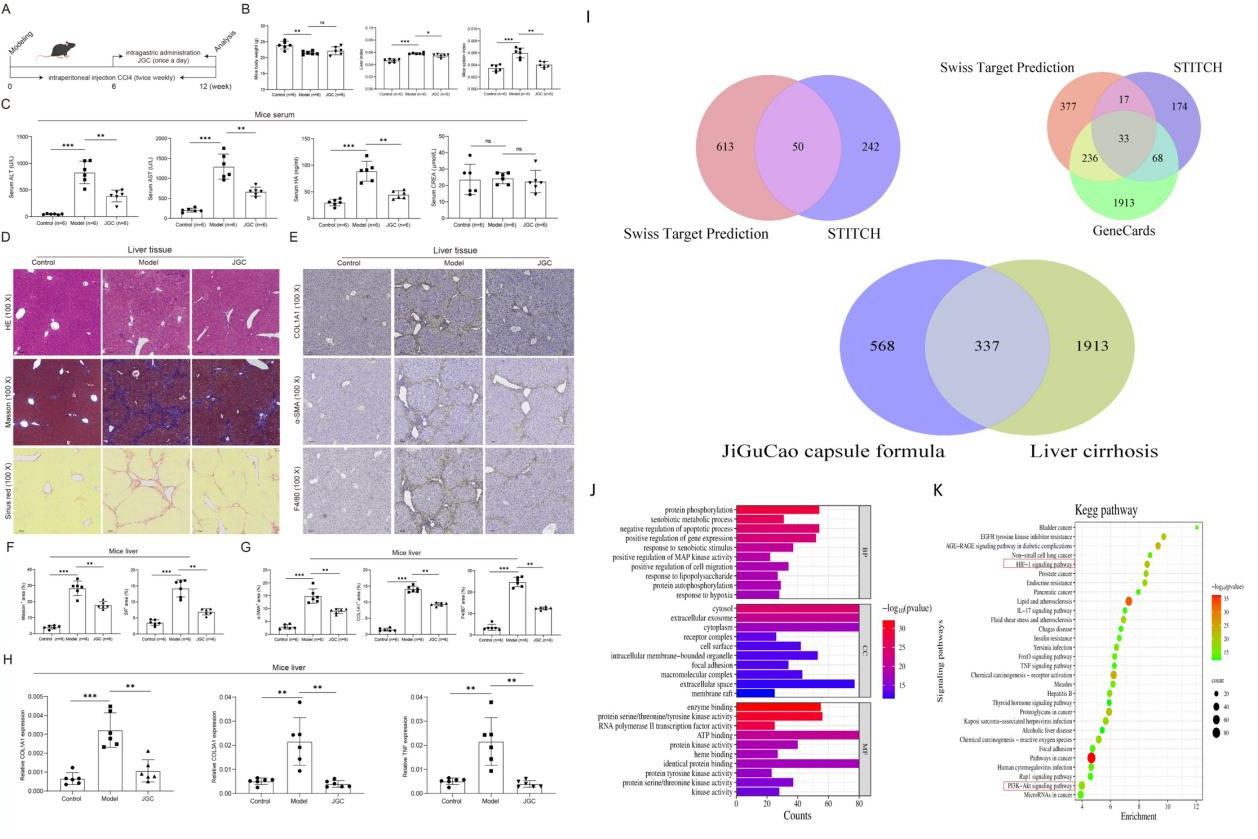 研究結(jié)果顯示,與模型組相比,雞骨草膠囊顯著增加了模型小鼠體重,降低肝脾指數(shù);雞骨草膠囊治療組的血清ALT、AST和HA水平顯著低于模型組。HE染色、天狼星紅染色、Masson染色和免疫組化染色結(jié)果顯示,與模型組相比,雞骨草膠囊治療組的肝臟組織炎癥損傷和膠原生成較少。經(jīng)過UHPLC-MS/MS分析和數(shù)據(jù)庫挖掘,獲得雞骨草膠囊靶點和肝硬化(liver cirrhosis,LC)靶點之間的337個重疊基因(OGEs)。GO分析結(jié)果顯示,靶點主要富集在蛋白磷酸化、胞質(zhì)和酶結(jié)合等方面。KEGG通路富集分析顯示,關(guān)鍵靶點與HIF-1信號通路和PI3K-Akt信號通路顯著相關(guān)。研究表明,雞骨草膠囊可有效逆轉(zhuǎn)小鼠早期肝硬化的進(jìn)展,其分子機(jī)制可能與HIF-1信號通路和PI3K-Akt信號通路的調(diào)控有關(guān)[1]。