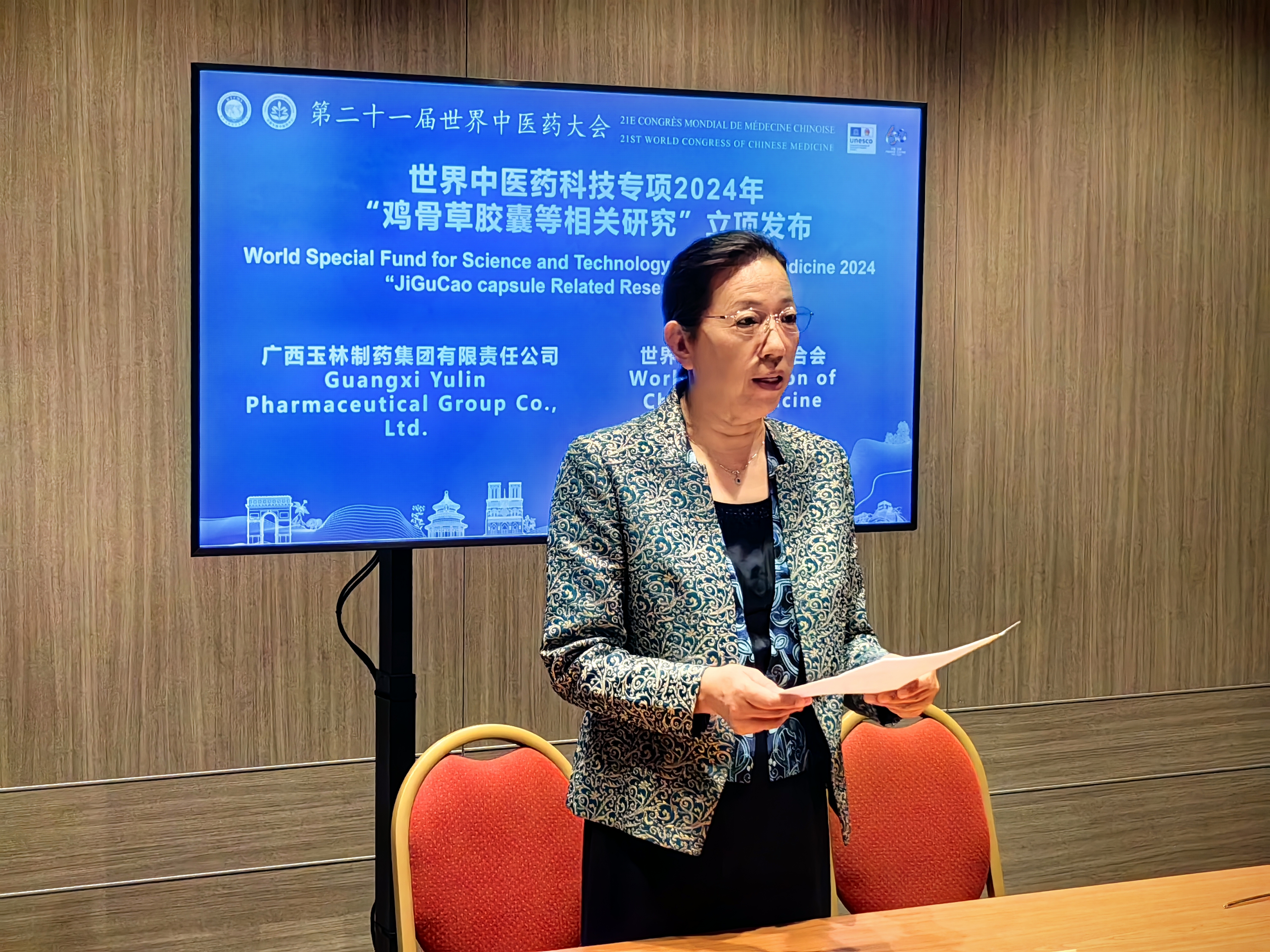 ▲ 圖 | 世界中聯(lián)副秘書長徐春波宣讀“雞骨草膠囊等相關(guān)研究”立項項目通知