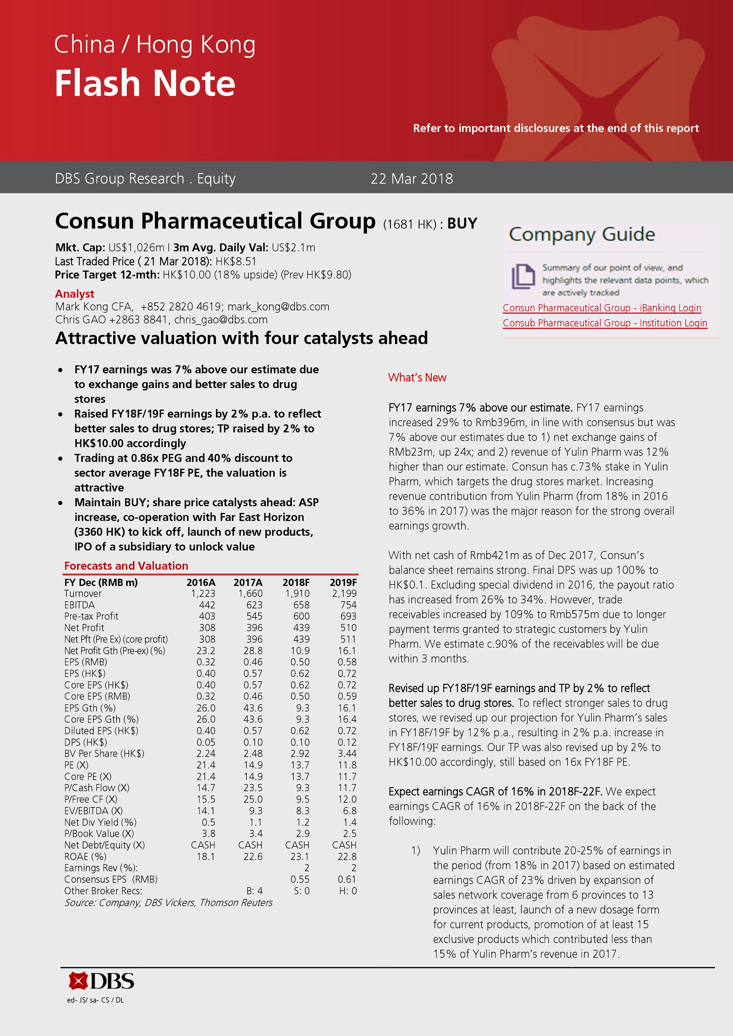 將FY18F / 19F盈利及目標價調(diào)高2%,以反映強勁的藥店銷售增長。為反映藥店銷售增長強勁,我們將玉林制藥18財年的銷售預(yù)測上調(diào)12%至每公斤12%。FY18F / 19F收益增加。我們的目標價亦相應(yīng)上調(diào)2%至10.00港元,仍然以16倍FY18F市盈率為基準。