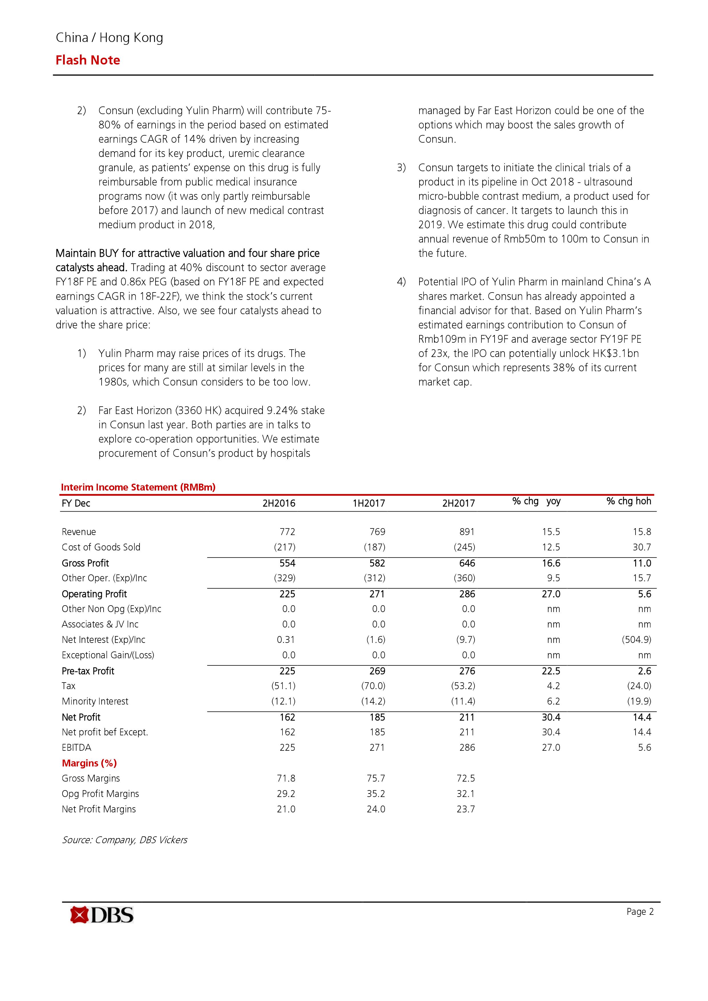 2)由于其關(guān)鍵產(chǎn)品尿毒清顆粒的需求增加,康臣藥業(yè)(不包括玉林制藥)將貢獻該期間收益的75%至80%,因為該藥物的患者費用可以全額償還從現(xiàn)在的公共醫(yī)療保險計劃(到2017年僅部分償還)和2018年推出新的醫(yī)用造影劑產(chǎn)品,