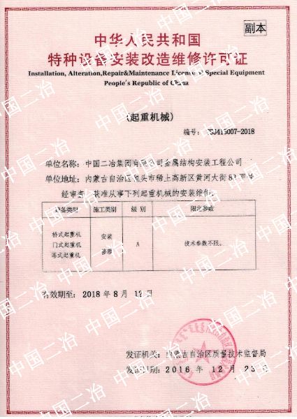 下一篇: 中華人民共和國特種設(shè)備安裝改造維修許可證(壓力管道)