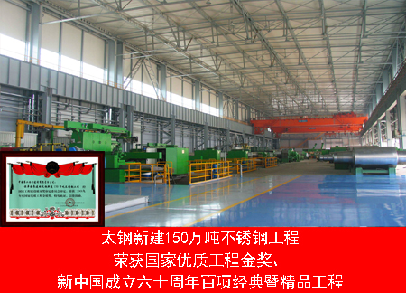 山西太鋼新建150萬噸不銹鋼工程,是山西鋼鐵集團(tuán)有限公司“十五規(guī)劃”中的重點(diǎn)項(xiàng)目。獲得“國(guó)家優(yōu)質(zhì)工程金質(zhì)獎(jiǎng)”、“新中國(guó)成立六十周年百項(xiàng)經(jīng)典暨精品工程”、改革開放三十五周年百項(xiàng)經(jīng)典暨精品工程。
