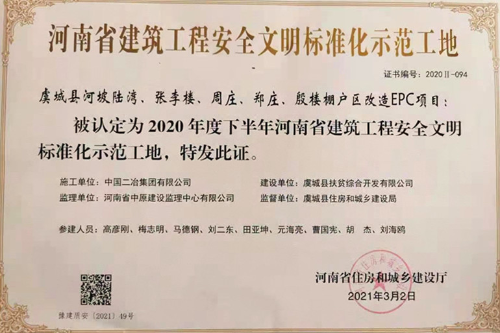 4月1日, 中國二冶鋼構(gòu)分公司承建的虞城棚改項(xiàng)目被河南省住房和城鄉(xiāng)建設(shè)廳評(píng)為 2020年下半年“省級(jí)建筑施工安全標(biāo)準(zhǔn)化示范工地”稱號(hào) ,這是該項(xiàng)目部成立以來繼獲得商丘市“安全標(biāo)準(zhǔn)化示范工地”稱號(hào)后獲得的又一榮譽(yù),實(shí)現(xiàn)了該公司在中原地區(qū)省級(jí)安全文明施工獎(jiǎng)項(xiàng)方面零的突破。