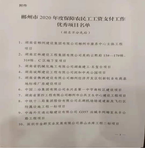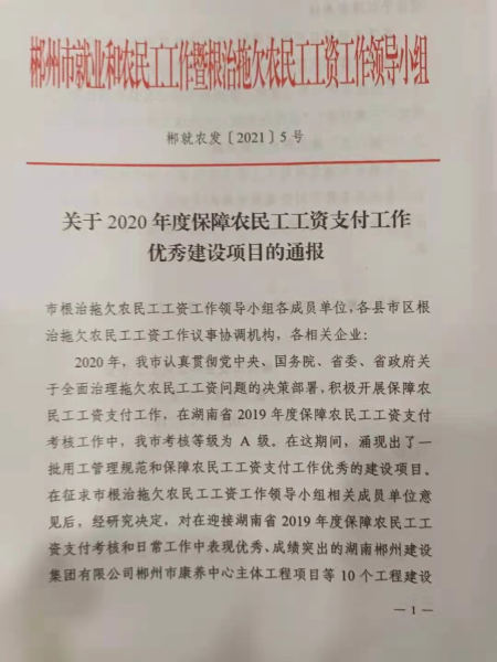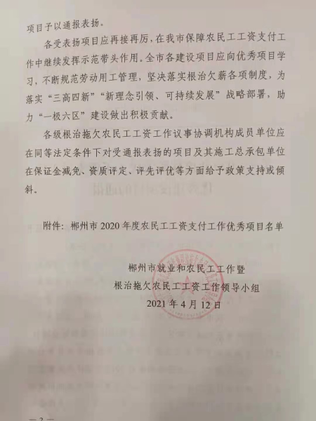 4月14日,中國二冶鋼構(gòu)分公司湖南永興一中項目獲得2020年度湖南省郴州市保障農(nóng)民工工資支付工作優(yōu)秀建設(shè)項目榮譽稱號。