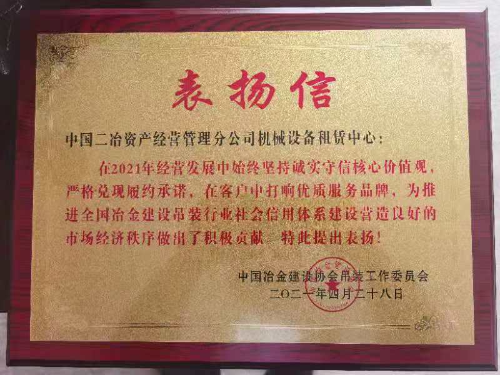 表?yè)P(yáng)信指出:中國(guó)二冶資產(chǎn)公司機(jī)械設(shè)備租賃中心在2021年經(jīng)營(yíng)發(fā)展中始終堅(jiān)持“誠(chéng)實(shí)守信 合作共贏”核心價(jià)值觀,嚴(yán)格兌現(xiàn)履約承諾,在客戶中打響優(yōu)質(zhì)服務(wù)品牌,為推動(dòng)全國(guó)冶金建設(shè)吊裝行業(yè)社會(huì)信用體系建設(shè)、營(yíng)造良好市場(chǎng)經(jīng)濟(jì)秩序做出了積極貢獻(xiàn)。