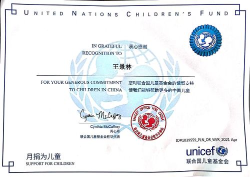 6月9日,聯(lián)合國兒童基金會(huì)致謝中國二冶優(yōu)秀青年員工王景林,對(duì)其多年來堅(jiān)持向聯(lián)合國兒童基金會(huì)捐款表示衷心感謝。