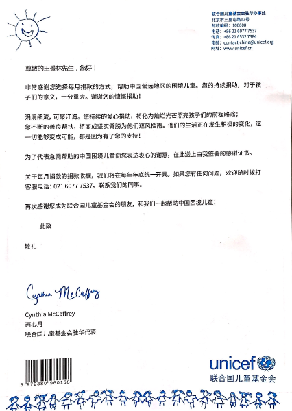 在信的最后,聯(lián)合國兒童基金會(huì)駐華代表再次代表急需幫助的中國困境兒童向該同志表達(dá)了衷心的謝意。