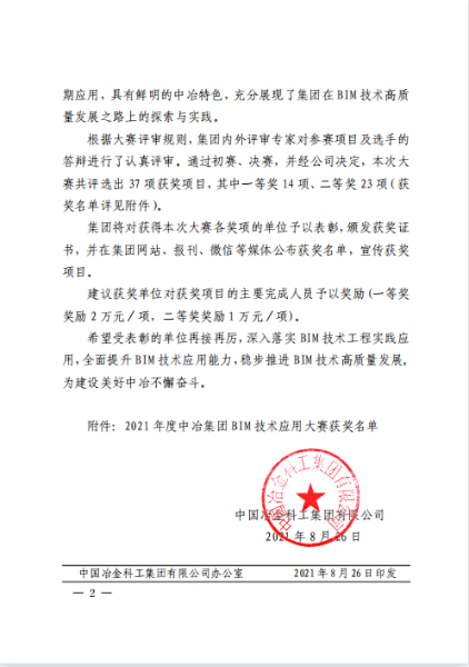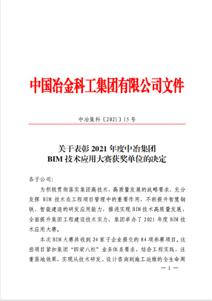 8月26日,中冶集團(tuán)〔2021〕5號(hào)文件《關(guān)于表彰2021年度中冶集團(tuán)BIM技術(shù)應(yīng)用大賽獲獎(jiǎng)單位的決定》揭曉獲獎(jiǎng)名單,中國二冶包頭市實(shí)訓(xùn)基地項(xiàng)目《包頭高技能人才公共實(shí)訓(xùn)基地項(xiàng)目BIM技術(shù)應(yīng)用》在本次大賽中榮獲“2021年度中冶集團(tuán)BIM技術(shù)應(yīng)用大賽二等獎(jiǎng)”。