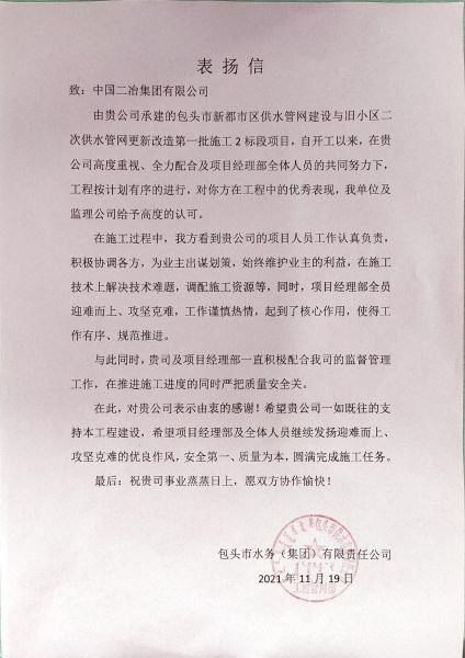 11月24日,包頭市水務(wù)(集團)有限責(zé)任公司向中國二冶發(fā)來表揚信,對中國二冶在新都市區(qū)供水管網(wǎng)建設(shè)與舊小區(qū)二次供水管網(wǎng)更新改造第一批施工2標(biāo)段項目的建設(shè)中用實際行動踐行的“一天也不耽誤,一天也不懈怠”的企業(yè)精神及項目人員優(yōu)秀的專業(yè)素質(zhì)和過硬的技術(shù)水平給予充分的肯定和高度贊揚,對管道公司領(lǐng)導(dǎo)給予該工程的重視支持及項目建設(shè)人員的付出與努力表示衷心感謝。