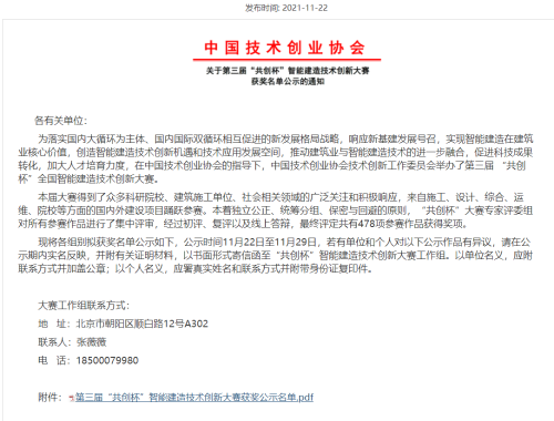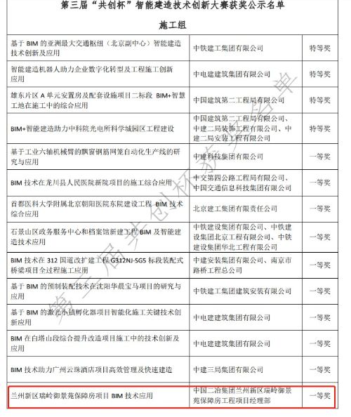 11月30日,由中國(guó)技術(shù)創(chuàng)業(yè)協(xié)會(huì)技術(shù)創(chuàng)新委員會(huì)主辦的第三屆“共創(chuàng)杯”智能建造技術(shù)創(chuàng)新大賽比賽結(jié)果揭曉,中國(guó)二冶集團(tuán)“蘭州新區(qū)瑞嶺御景苑項(xiàng)目的BIM技術(shù)應(yīng)用”榮獲施工組一等獎(jiǎng),“基于BIM技術(shù)在張家川回族自治縣中醫(yī)醫(yī)院醫(yī)技綜合樓及二期建設(shè)項(xiàng)目的施工應(yīng)用”作品榮獲施工組二等獎(jiǎng)。