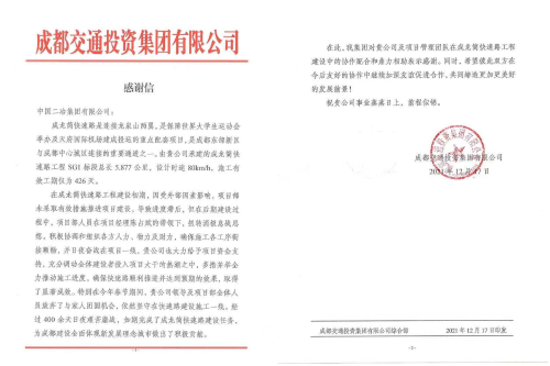 12月17日,成都交通投資集團(tuán)有限公司致中國二冶表揚信,對中國二冶四川分公司在成龍簡快速路工程項目施工建設(shè)中,攻堅克難、頑強(qiáng)奮戰(zhàn),優(yōu)質(zhì)、安全、高效地完成施工建設(shè)任務(wù),順利實現(xiàn)快速路主體工程全線貫通給予表揚。