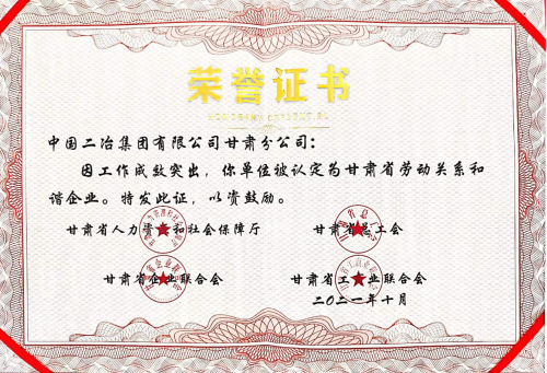 12月23日,經(jīng)甘肅省人力資源和社會保障廳、總工會、工商聯(lián)、企業(yè)聯(lián)合會聯(lián)合認(rèn)定,中國二冶集團(tuán)甘肅分公司被認(rèn)定為“甘肅省勞動關(guān)系和諧企業(yè)”。