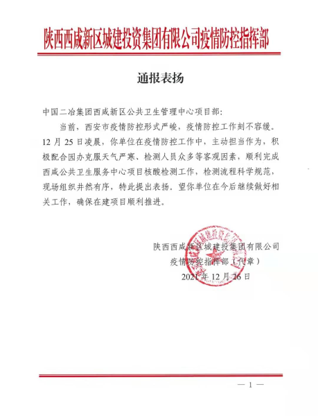 表揚信中說到,當前西安市疫情防控形勢嚴峻,疫情防控工作刻不容緩。12月25日凌晨,中國二冶西咸新區(qū)公共衛(wèi)生管理中心項目部在疫情防控工作中,主動擔當作為,積極配合園辦克服天氣嚴寒、檢測人員眾多等客觀因素,順利完成西咸公共衛(wèi)生服務中心項目核酸檢測工作,檢測流程科學規(guī)范,現場組織井然有序。信中還說,希望西咸新區(qū)公共衛(wèi)生管理中心項目部在今后繼續(xù)做好相關工作,確保在建項目順利推進。