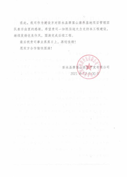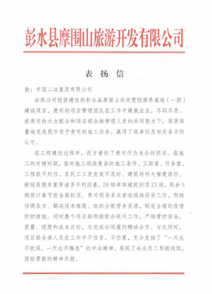 1月4日,中國二冶內(nèi)蒙古分公司項(xiàng)目經(jīng)理部收到項(xiàng)目建設(shè)方彭水縣摩圍山旅游開發(fā)有限公司表揚(yáng)信,信中對中國二冶集團(tuán)內(nèi)蒙古分公司在項(xiàng)目建設(shè)中履行央企責(zé)任、彰顯央企實(shí)力與擔(dān)當(dāng)給予高度贊譽(yù)。