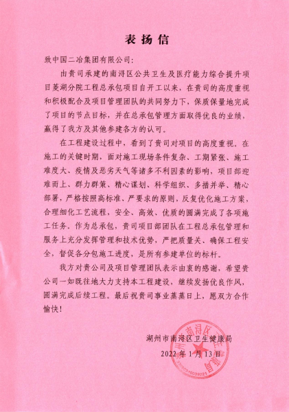 1月15日,中國(guó)二冶收到湖州市南潯區(qū)衛(wèi)生健康局表?yè)P(yáng)信,信中對(duì)中國(guó)二冶路橋分公司菱湖分院項(xiàng)目部在工程總承包管理和服務(wù)上充分發(fā)揮管理和技術(shù)優(yōu)勢(shì),嚴(yán)把質(zhì)量關(guān)、確保工程安全,全力搶抓施工進(jìn)度予以肯定。