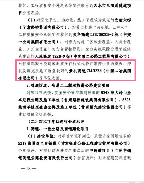 1月19日,甘肅省交通運輸廳發(fā)布《關(guān)于2021年下半年公路工程建設(shè)項目綜合督查和設(shè)計變更專項督查的通報》,對中國二冶景禮項目引進(jìn)仰拱混凝土澆筑液壓自行式棧橋自帶仰拱曲面模板,較好地破解了施工的難題給予充分肯定,并給予通報表揚。