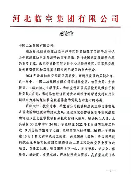 1月21日,中國二冶廊坊航空物流起步區(qū)北區(qū)學(xué)校工程項(xiàng)目、廊坊航空物流起步區(qū)南區(qū)道路工程項(xiàng)目收到來自甲方河北臨空集團(tuán)有限公司發(fā)來的表揚(yáng)信。