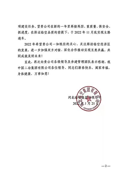 信中指出,在過去的一年里,中國二冶深耕臨空區(qū),站位大局、主動擔(dān)當(dāng)、主動對接、主動服務(wù),為臨空經(jīng)濟(jì)區(qū)高質(zhì)量發(fā)展做出了積極貢獻(xiàn)。中國二冶臨空經(jīng)濟(jì)區(qū)學(xué)校與道路兩項(xiàng)目部積極克服諸多建設(shè)難題,科學(xué)組織、搶抓工期,全力以赴推進(jìn)項(xiàng)目建設(shè),高質(zhì)量完成各項(xiàng)建設(shè)任務(wù)。希望項(xiàng)目部永葆初心使命,雷厲風(fēng)行、使命必達(dá),繼續(xù)高標(biāo)準(zhǔn)、高質(zhì)量完成后續(xù)建設(shè)任務(wù),同時(shí)關(guān)注廊坊臨空經(jīng)濟(jì)區(qū)的發(fā)展,進(jìn)一步加強(qiáng)雙方對接,深化合作推動實(shí)現(xiàn)互惠共贏,共同成就美好未來。