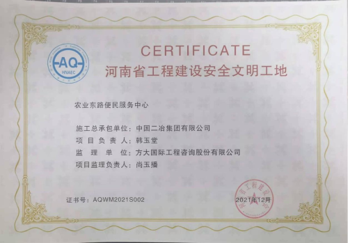 1月23日,從河南省工程建設(shè)協(xié)會(huì)傳來(lái)喜訊,中國(guó)二冶承建的河南鄭州農(nóng)業(yè)東路便民服務(wù)中心項(xiàng)目榮獲河南省2021年度“工程建設(shè)安全文明工地”稱(chēng)號(hào)。