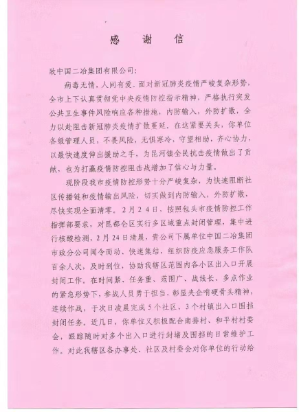 中國二冶收到昆河鎮(zhèn)政府感謝信 ——表揚(yáng)中國二冶抗疫中的央企擔(dān)當(dāng)