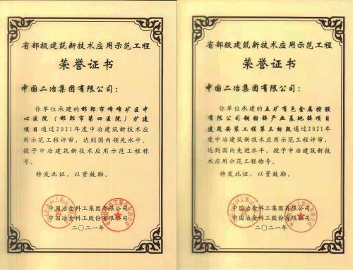 3月28日,中國(guó)二冶承建的五礦有色銅鉛鋅產(chǎn)業(yè)基地鋅項(xiàng)目建筑安裝工程第三標(biāo)段項(xiàng)目和邯鄲市峰峰礦區(qū)中心醫(yī)院(邯鄲市第四醫(yī)院)擴(kuò)建項(xiàng)目工程榮獲2021年度中國(guó)冶金科工集團(tuán)有限公司、中國(guó)冶金科工股份有限公司建筑新技術(shù)應(yīng)用示范工程。