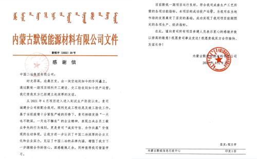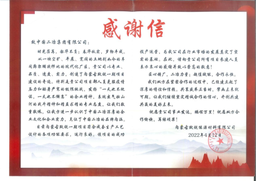 4月8日和12日,中國二冶連續(xù)收到內(nèi)蒙古默銳能源材料有限公司的兩封感謝信,盛贊中國二冶在默銳一期項目建設(shè)中,突破工期緊任務(wù)重等不利因素,高標準嚴要求,精益求精匠心智造,披荊斬棘打造樣板工程,優(yōu)質(zhì)快速完成工程建設(shè)任務(wù),充分彰顯冶金建設(shè)國家隊的央企責(zé)任和擔(dān)當(dāng)。