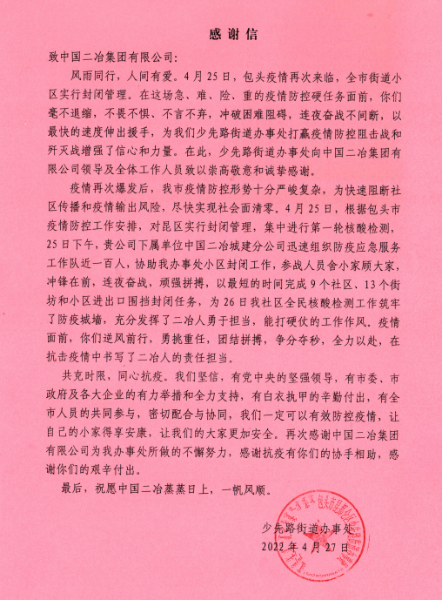 4月27日,包頭市昆區(qū)少先路街道辦事處致中國二冶感謝信,表揚(yáng)中國二冶在這場急、難、險(xiǎn)、重的疫情防控硬任務(wù)面前,毫不退縮,不畏不懼、不言不棄,沖破困難阻礙,連夜奮戰(zhàn)不間斷,以最快的速度伸出援手,近一百名職工沖鋒到社區(qū)疫情封控一線,全力配合昆區(qū)政府順利完成任務(wù)。特向中國二冶干部職工致以崇高敬意和衷心感謝!