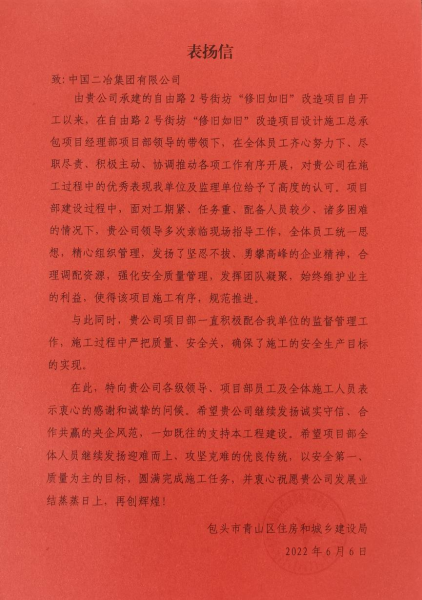 6月10日,中國(guó)二冶收到包頭市青山區(qū)住房和城鄉(xiāng)建設(shè)局發(fā)來(lái)的表?yè)P(yáng)信。信中贊揚(yáng)中國(guó)二冶在青山區(qū)自由路2號(hào)街坊“修舊如舊”改造項(xiàng)目建設(shè)過(guò)程中,攻堅(jiān)克難,精細(xì)部署,有序推進(jìn),以實(shí)際行動(dòng)充分體現(xiàn)了二冶人的實(shí)干擔(dān)當(dāng)。