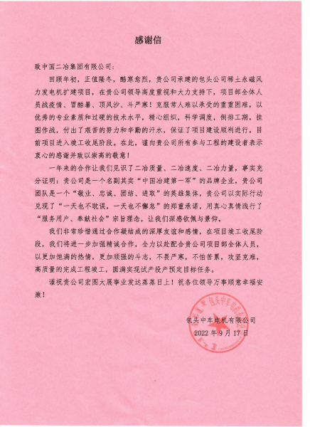 中國(guó)二冶收到包頭中車電機(jī)有限公司表?yè)P(yáng)信