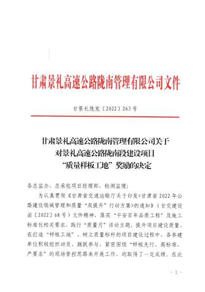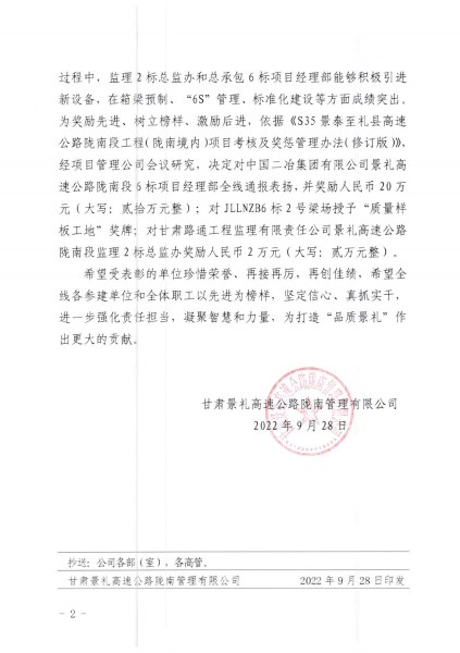 9月28日,甘肅景禮高速公路隴南管理有限公司發(fā)布通報(bào),對中國二冶甘肅分公司景禮項(xiàng)目部在“質(zhì)量樣板工地”評比中獲得優(yōu)異成績進(jìn)行通報(bào)表揚(yáng),景禮項(xiàng)目部二號梁場榮獲“質(zhì)量樣板工地”獎(jiǎng)牌,并給予20萬元嘉獎(jiǎng)。