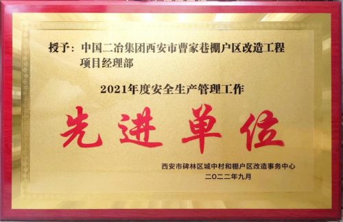 9月28日,中國二冶西安市曹家巷棚戶區(qū)改造工程收到由西安市碑林區(qū)城中村和棚戶區(qū)改造事務(wù)中心頒發(fā)的“2021年度安全生產(chǎn)管理工作先進單位”榮譽證書。