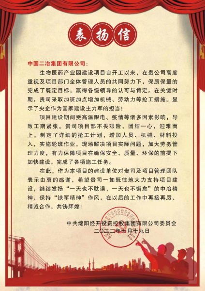 10月19日,綿陽經(jīng)開投資控股集團有限公司向中國二冶致表揚信,對中國二冶生物醫(yī)藥產(chǎn)業(yè)園項目在建設(shè)過程中精心組織施工和辛勤付出給予表揚,同時對項目管理團隊在高溫限電、疫情防控期間,表現(xiàn)出頑強拼搏的施工風范高度贊賞。