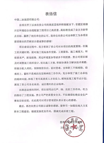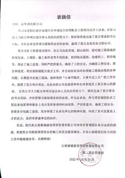 10月22日,中國二冶官渡項目部連續(xù)收到兩封來自業(yè)主單位昆明市官渡區(qū)水務局和云南睿城建設項目有限公司的表揚信,對中國二冶路橋分公司官渡項目部在官渡區(qū)南部片區(qū)環(huán)境綜合治理配套工程項目建設過程中,直面多種困難,精心策劃、科學管理、全力以赴的工作態(tài)度表示贊賞。