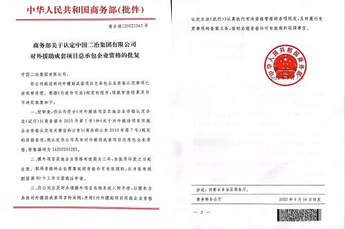 對(duì)外援助成套項(xiàng)目實(shí)施企業(yè)資格是企業(yè)“走出去”的一張重要名片。2015年,商務(wù)部頒發(fā)了《對(duì)外援助成套項(xiàng)目管理辦法(試行)》,對(duì)所有企業(yè)援外資格重新認(rèn)定,由過(guò)去全國(guó)348家援外成套A級(jí)資質(zhì)企業(yè)壓縮到70家之內(nèi)。在商務(wù)部調(diào)整對(duì)外援助管理制度下,2016年,中國(guó)二冶成功通過(guò)資格審批,首次獲批對(duì)外援助成套項(xiàng)目總承包企業(yè)資格(有效期三年)。中國(guó)二冶高度重視援外資質(zhì)的維護(hù)與管理,在資格許可有效期屆滿前,積極主動(dòng)與商務(wù)部相關(guān)主管部門聯(lián)系,建立良好的溝通渠道,密切跟進(jìn)資格延續(xù)進(jìn)展,2019年,首次資格延續(xù)審查工作順利通過(guò)。2022年,公司克服疫情等不利因素,按照商務(wù)部公告,年初,公司主要領(lǐng)導(dǎo)親自部署、統(tǒng)籌協(xié)調(diào),對(duì)申報(bào)工作做出明確指示。在自治區(qū)商務(wù)廳、包頭市商務(wù)局、中國(guó)中冶海外工程和礦業(yè)管理部的大力支持下,按照商務(wù)部頒發(fā)的《對(duì)外援助成套項(xiàng)目實(shí)施企業(yè)資格認(rèn)定辦法》提前謀劃、精心準(zhǔn)備申報(bào)資料。歷經(jīng)半年多時(shí)間,經(jīng)過(guò)內(nèi)蒙古自治區(qū)商務(wù)廳初審、復(fù)審,中華人民共和國(guó)商務(wù)部初審、復(fù)審,最終再次獲批對(duì)外援助成套項(xiàng)目總承包企業(yè)資格。