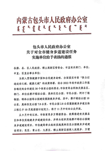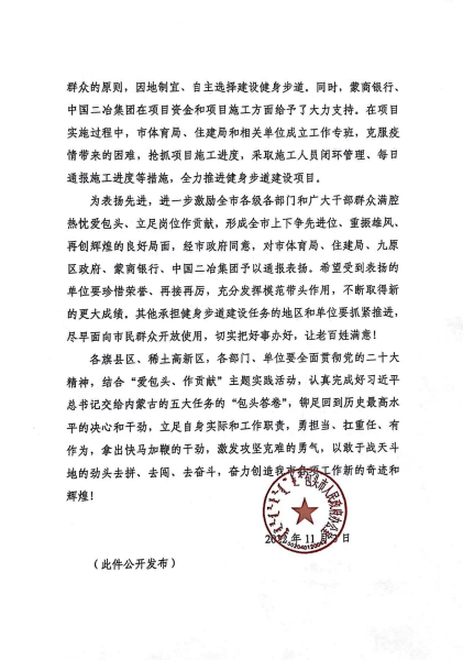 11月9日,中國二冶收到包頭市政府表揚(yáng)信,對中國二冶在包頭市健身步道建設(shè)任務(wù)中所作的突出貢獻(xiàn)表示高度贊揚(yáng)。