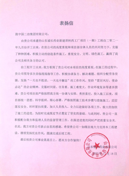 11月21日,山東福長藥業(yè)有限公司致中國二冶表揚信,對中國二冶山東分公司承建的山東福長藥業(yè)新建原料藥工廠(一期)項目不畏艱難、保證施工質(zhì)量表示認可,對中國二冶項目管理團隊的各項工作給予高度贊揚。