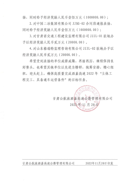 11月23日,甘肅公航旅酒嘉高速公路管理有限公司在酒嘉繞城高速公路項(xiàng)目全線發(fā)出通報(bào),對(duì)中國(guó)二冶酒嘉項(xiàng)目部在關(guān)鍵性、控制性工程節(jié)點(diǎn)的建設(shè)任務(wù)完成出色,在工程質(zhì)量、安全生產(chǎn)等方面的突出表現(xiàn)給予通報(bào)表?yè)P(yáng),并給予100萬(wàn)元經(jīng)濟(jì)獎(jiǎng)勵(lì)。