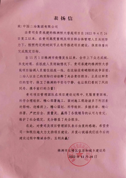 表?yè)P(yáng)信中指出,自11月1日株洲市疫情發(fā)生以來(lái),全市上下眾志成城、共克時(shí)艱,在抗疫人員短缺情況下,中國(guó)二冶株洲恒大項(xiàng)目部抽調(diào)職工前往抗疫一線,為當(dāng)?shù)匾咔榉揽毓ぷ魈峁┯辛ΡU?。在這場(chǎng)沒(méi)有硝煙的戰(zhàn)爭(zhēng)面前,二冶人以自己的實(shí)際行動(dòng)詮釋了央企責(zé)任擔(dān)當(dāng),正是這種責(zé)任的堅(jiān)守,保衛(wèi)了株洲的平安與寧?kù)o,也讓當(dāng)?shù)卣吹搅硕憋L(fēng)雨同舟、攜手前行的力量!并且在恒大項(xiàng)目復(fù)工建設(shè)過(guò)程中,面對(duì)施工現(xiàn)場(chǎng)諸多不利因素的影響,中國(guó)二冶項(xiàng)目部管理人員迎難而上,克服重重困難,精心部署,贏得了各級(jí)領(lǐng)導(dǎo)的認(rèn)可與肯定,維護(hù)了社會(huì)穩(wěn)定,充分彰顯了央企擔(dān)當(dāng)。