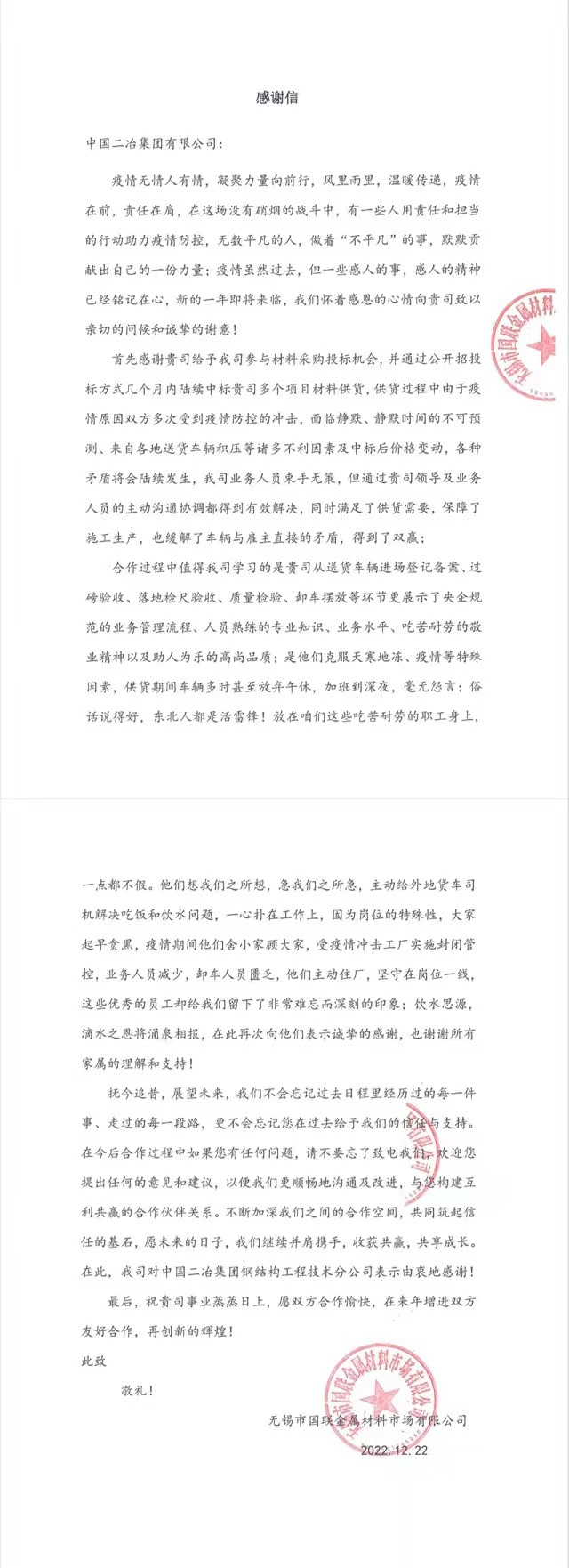 無錫市國聯(lián)金屬材料市場(chǎng)有限公司在感謝信中指出,撫今追昔,展望未來,我們不會(huì)忘記過去日子里經(jīng)歷過的每一件事,走過的每一段路,更不會(huì)忘記中國二冶在過去給予我們的信任與支持。讓我們構(gòu)建互利共贏的合作伙伴關(guān)系,不斷加深合作,共同筑起信任的基石,繼續(xù)并肩攜手,收獲共贏,共享成長。