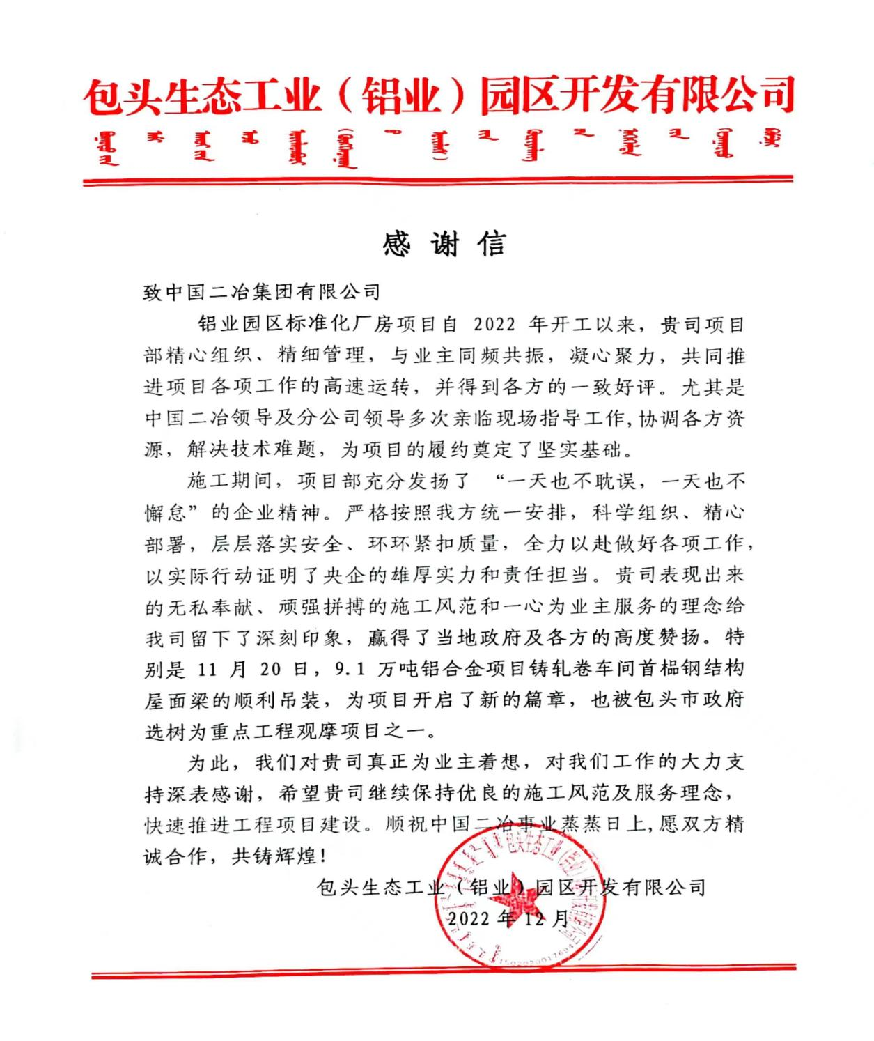 華北鋁業(yè)有限公司在信中指出,中國二冶在施工期間,嚴(yán)格按照網(wǎng)絡(luò)工期,科學(xué)組織、精心部署,克服疫情帶來的勞動(dòng)力不足等不利影響,夜以繼日加班加點(diǎn)大干,確保了12月25日項(xiàng)目鋼結(jié)構(gòu)屋面梁制安的順利結(jié)束,貴司所表現(xiàn)出來的無私奉獻(xiàn)、頑強(qiáng)拼搏的施工風(fēng)范和為業(yè)主服務(wù)的理念給我司留下了深刻印象,同時(shí)也贏得了各方的高度評(píng)價(jià)。你們以實(shí)際行動(dòng)證明了央企的雄厚實(shí)力和責(zé)任擔(dān)當(dāng)。