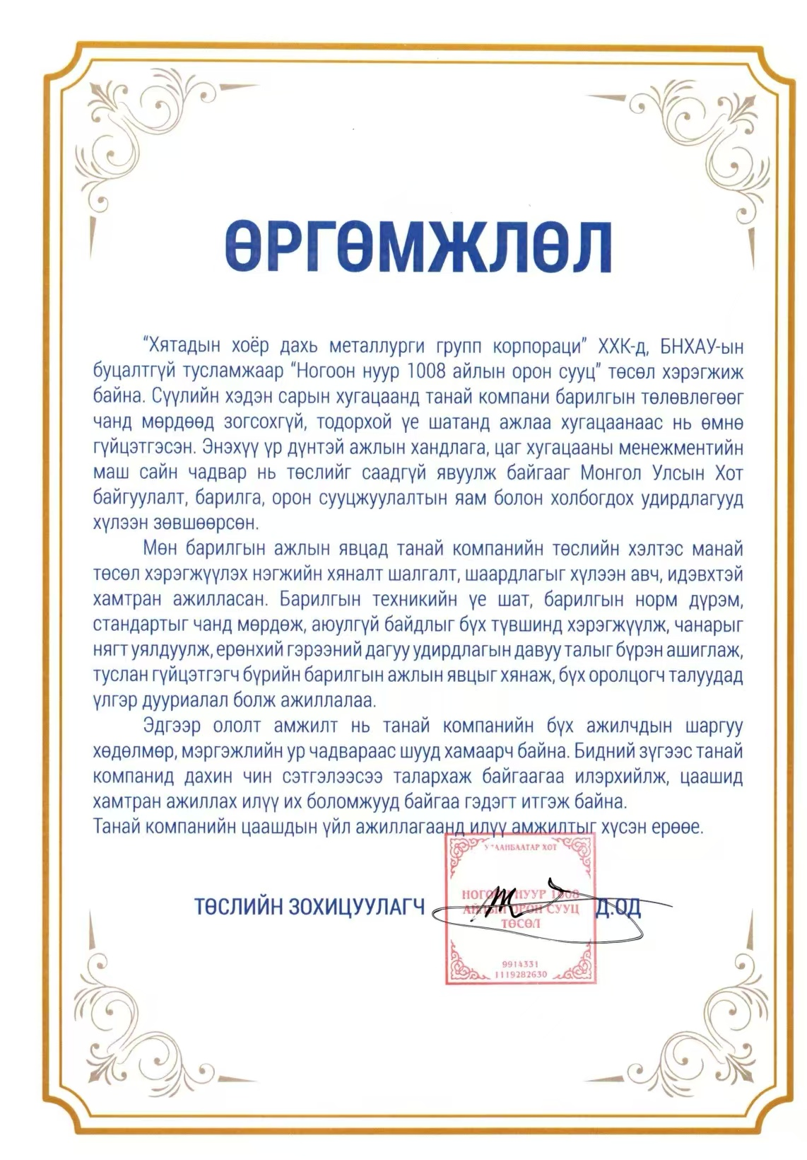 表?yè)P(yáng)信指出,由中華人民共和國(guó)援建、中國(guó)二冶承建的“綠湖1008戶”住宅樓項(xiàng)目遵守施工計(jì)劃,在重要節(jié)點(diǎn)重要工序超前完成了施工任務(wù),受到了蒙古國(guó)城建部及相關(guān)領(lǐng)導(dǎo)的認(rèn)可。施工期間,項(xiàng)目部能夠主動(dòng)接受檢查與督導(dǎo),積極配合,協(xié)同發(fā)力,尤其是施工關(guān)鍵時(shí)期,項(xiàng)目部勇?lián)厝?,?yán)格按照工程技術(shù)、設(shè)計(jì)規(guī)范、施工步驟與措施,層層落實(shí)安全、環(huán)保責(zé)任,緊扣質(zhì)量標(biāo)準(zhǔn),抓實(shí)分部分項(xiàng)工程質(zhì)量,充分發(fā)揮了施工總承包方的管理優(yōu)勢(shì),全方位督促各分包施工進(jìn)度,加快項(xiàng)目建設(shè)步伐,是所有參建單位的標(biāo)桿,充分彰顯了中國(guó)央企的實(shí)力。